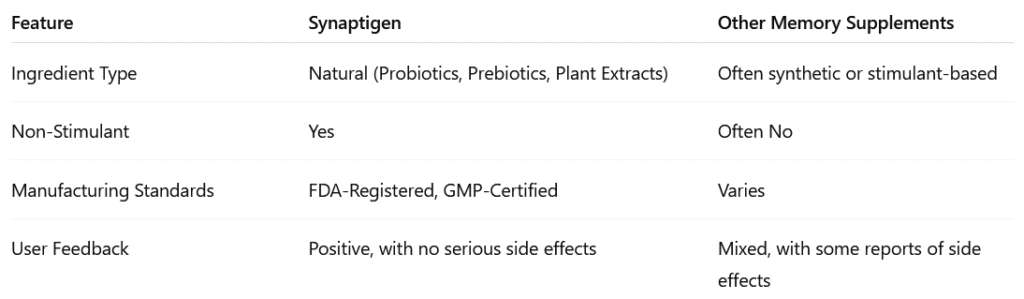 Unlike generic brain supplements, Synaptigen targets the root causes: oxidative stress, nutrient deficiencies, and daily cognitive strain. It works deep, supporting neural health, reducing mental fatigue, and helping you maintain independence, confidence, and mental sharpness naturally.